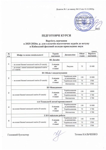 Підготовчі курсиПІДГОТОВЧІ КУРСИ ДЛЯ ВСТУПУ В КИЇВСЬКИЙ ФАХОВИЙ КОЛЕДЖ ПРИКЛАДНИХ НАУК: ВАШ УСПІШНИЙ СТАРТ У СВІТІ ЗНАНЬ! Для абітурієнтів, які мріють про навчання в Коледжі, наші підготовчі курси — це чудова можливість зміцнити знання, впевнено підготуватися до іспитів і зробити перший крок до професійного успіху. Положення про підготовчі курси КФКПН Підготовка слухачів здійснюється за такими дисциплінами: