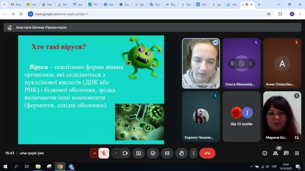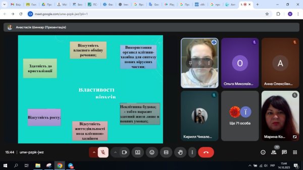 14 жовтня Анастасія Шинкар, студентка спеціальності Соціальна робота, долучилася до участі у міжвузівському семінарі на тему: "Організація практичної та науково-дослідницької діяльності студентів коледжів з біології та екології". Для доповіді Анастасія обрала тему “Вірусна інфекція, шляхи потрапляння в організм, механізм дії вірусів та захист”. Доповідь була підготовлена за консультаційним супроводом викладачки Олени Биліни та голови профспілкової організації студентів Марини Коломієць. Також в онлайн заході взяли участь студенти - профспілкові лідери Богдана Сушко, Ольга Хоптинська та Вероніка Маслій.