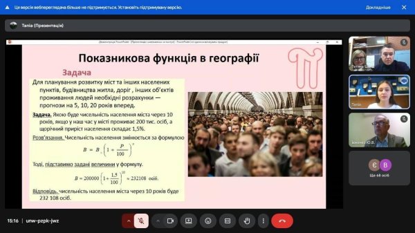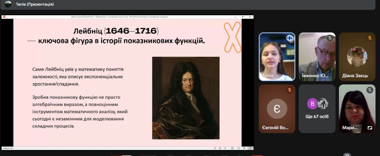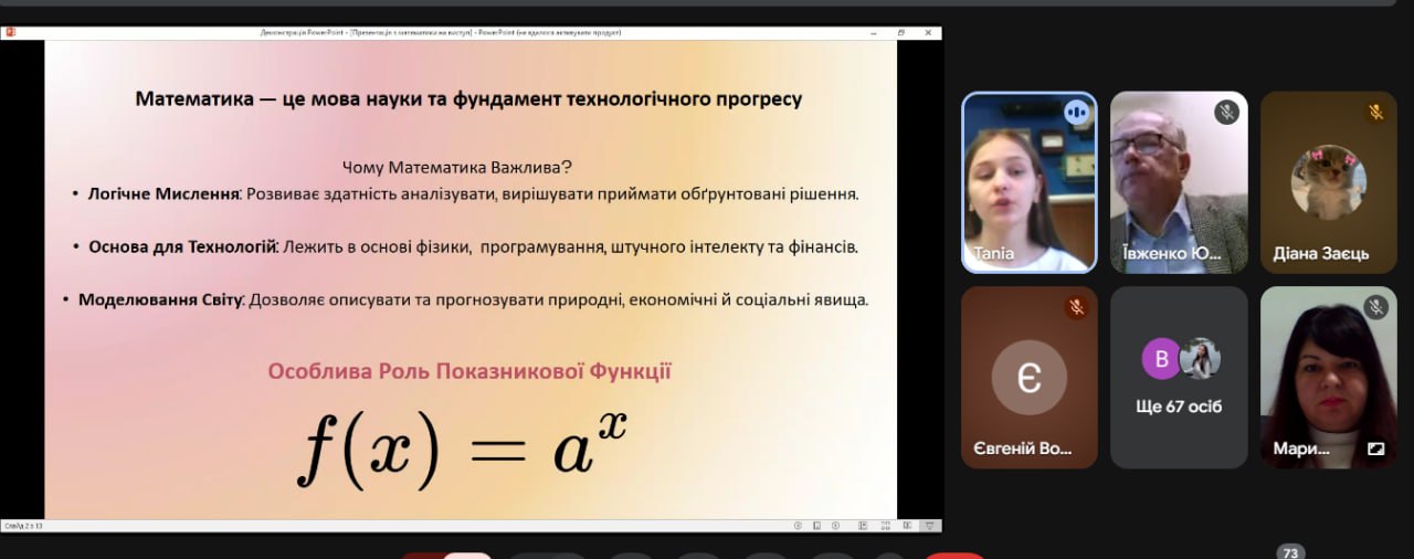 Із доповіддю на тему “Показникова функція і її застосування” виступила студентка відділення Бізнес Тетяна Плотникова. Керівником із підготовки доповіді був викладач комісії технологій легкої промисловості Віталій Швед. Також на онлайн-заході були присутні: голова профспілкової організації студентів Марина Коломієць та студенти-слухачі Вероніка Маслій і Анна Зборовська.