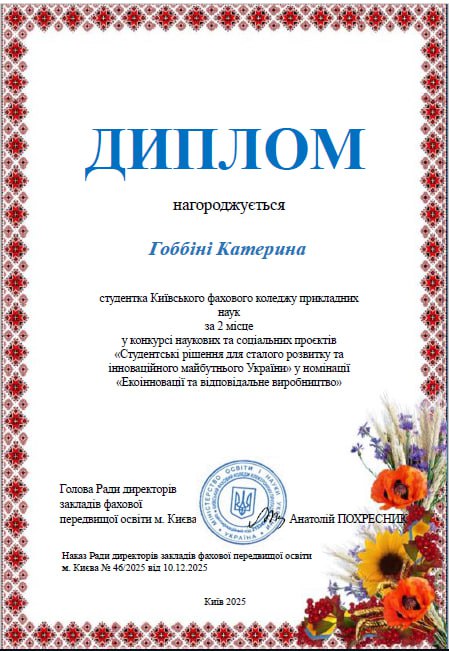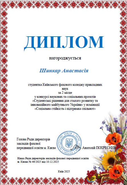 On December 2, 2025, KCAS students participated in the Interuniversity Scientific and Social Project Competition “Student Solutions for Sustainable Development and Innovative Future of Ukraine”. The event was organized by the Methodological Association of Heads of Student and Teacher Unions. KCAS students represented the college with dignity and won prizes in several nominations. Kateryna Gobbini, a student of the Technology Department, won 2nd place in the “Eco-Innovation and Responsible Production” nomination. Her project “New Life of Fabrics: Recycling as a Way to a Clean Ukraine” focused on the importance of responsible consumption, reuse of textile materials, and popularization of ecological thinking among young people. Anastasia Shynkar, a student of the Technology Department, won 2nd place in the “Social Sustainability and Community Support” nomination. Anastasia's project, entitled “Hear with the Heart: Inclusive Support for the Deaf and Military Who Have Lost Their Hearing,” is designed to draw attention to the problems of people with hearing impairments and the importance of creating conditions for their high-quality social support. The supervisor of both projects was the head of the student union, Maryna Kolomiyets. We congratulate our participants on a worthy representation of the college and wish them new creative achievements and victories!