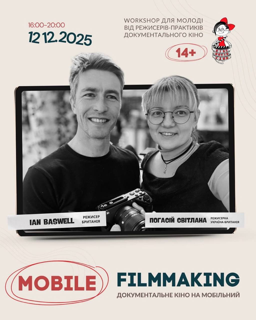 12.12.2025 у Київському фаховому коледжі прикладних наук відбувся воркшоп «Mobile Filmmaking: документальне кіно на мобільний» для молоді. Воркшоп провели Ян Басвелл — британський режисер-документаліст, оператор-постановник (Лондон), та Світлана Погасій — українська режисерка, президентка дитячого кінофестивалю KidsMovieFest. Участь у заході взяли: Під час воркшопу учасники ознайомилися з основами створення документального кіно за допомогою мобільних пристроїв та отримали практичні поради від професіоналів міжнародного рівня. Коментарі:Залишити коментар |