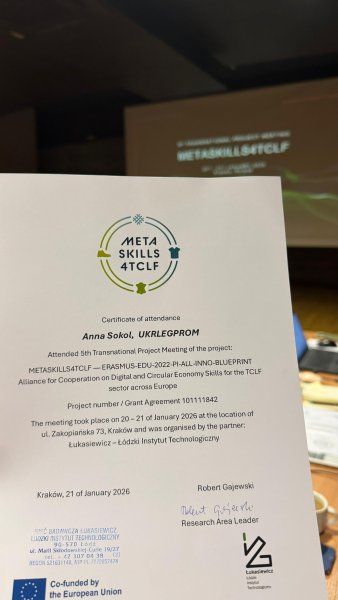 Фахівці Коледжу представили Укрлегпром на 5-й транснаціональній зустрічі METASKILLS4TCLFу Кракові 20–21 січня 2026 року приміщення Технологічного інституту Лукасєвча в Кракові (Польща) стало центром міжнародної співпраці у сфері моди, текстилю та шкіри. Тут відбулася 5-та Транснаціональна проєктна зустріч, яка об’єднала представників 21 провідної організації з Європи . У заході взяли участь галузеві експерти, науково-дослідні установи, галузеві та освітні асоціації з України, Бельгії, Португалії, Іспанії, Італії, Румунії, Німеччини, Франції, Греції, Швеції, та Польщі. Дводенна зустріч була присвячена розвитку стратегічних ініціатив у галузях TCLF (текстиль, шкіра, одяг, взуття). Особливу увагу було приділено розвитку навичок, інноваційним освітнім підходам, використанню віртуальної та доповненої реальності, а також створенню Європейського віртуального кампусу моди. Зустріч проходила в межах реалізації проєкту METASKILLS4TCLF, який спрямований на розробку стратегій розвитку навичок у секторі TCLF (текстиль, одяг, шкіра, взуття). Проєкт відповідає ключовим цілям ініціативи TCLF Skills Alliance та має на меті підтримати державні й приватні організації у підвищенні кваліфікації та перекваліфікації фахівців відповідно до Пакту Європейської комісії про ключові навички (Pact for Skills / PACT4SKILLS). Реалізація METASKILLS4TCLF також передбачає врахування та закріплення результатів Програми Skills4Smart TCLF Industries 2030, спрямованої на модернізацію та підвищення конкурентоспроможності секторів TCLF у Європейському Союзі. Проєкт METASKILLS4TCLF об’єднує партнерів з 11 країн, які спільно працюють над формуванням нової європейської промислової парадигми. Асоціація «Укрлегпром» разом із галузевими закладами освіти є співвиконавцем цього освітньо-прикладного проєкту, який реалізується впродовж 2023–2027 років для індустрій TCLF.Від Української асоціації підприємств легкої промисловості «Укрлегпром» у зустрічі взяли участь: Анна Сокол — завідувачка відділення бізнесу Київського фахового коледжу прикладних наук (очно), та Галина Єфимчук — представниця Волинського національного університету (дистанційно). Також з 2023 року у реалізації проєкту бере участь Ганна Щуцька — директорка Київського фахового коледжу прикладних, доктор технічних наук. Учасники активно працювали над питаннями управління проєктом, аналізували досягнуті результати та обговорювали впровадження нових навчальних інструментів, зокрема електронних книг із AR-додатками, онлайн-курсів і лабораторій віртуальної реальності. Окрему увагу було приділено зміцненню партнерств, створенню інтерактивних баз даних, оновленню європейських і національних стратегій розвитку навичок, а також пілотному впровадженню інноваційних методологій професійної освіти. За підсумками зустрічі партнери узгодили чітку дорожню карту на наступні шість місяців, зосереджену на практичному впровадженні Європейського віртуального кампусу моди та подальшому розвитку інноваційних освітніх ресурсів. П’ята Транснаціональна проєктна зустріч стала важливою віхою у спільних зусиллях, спрямованих на трансформацію та підвищення конкурентоспроможності секторів TCLF в Європі.