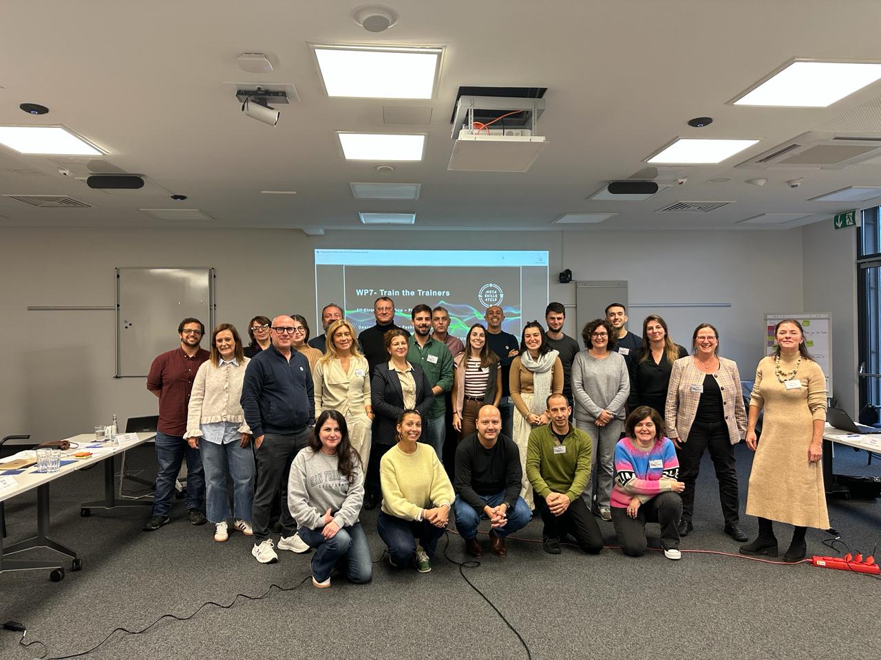 30 жовтня було присвячено темі Storytelling — сторітелінгу, тобто мистецтву створення історій, які поєднують бачення, навчальні інструменти й інноваційні підходи. Партнери з PIN SCRL та TUIASI представили кейс «Від бачення до інноваційних інструментів», що показав взаємозв’язок між навчальними програмами, мікрокваліфікаціями, VR-технологіями та системами оцінювання. У практичній частині учасники об’єдналися у групи, щоб розробити власні AR-концепції — ідеї для перетворення навчальних модулів у формат доповненої реальності. Після цього відбувся захист проєктів із використанням інтерактивного інструменту Mentimeter, обговорення та фінальне оцінювання від експертів PFI. Завершенням заходу стала екскурсія лабораторіями PFI, де учасники мали можливість ознайомитися з сучасним обладнанням для тестування матеріалів і взуття. Учасники тренінгу У програмі взяли участь представники одинадцяти партнерських організацій із різних країн Європи: