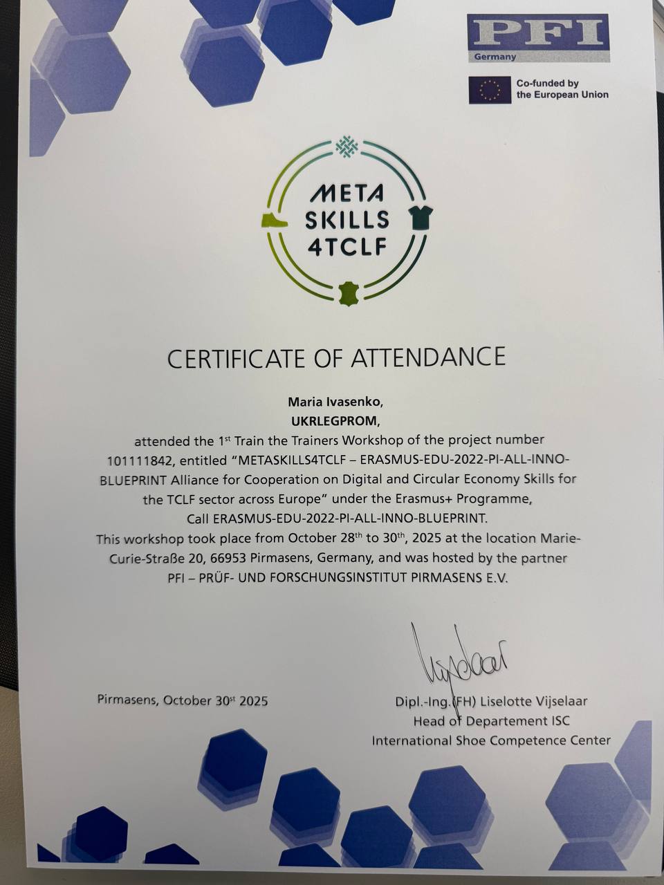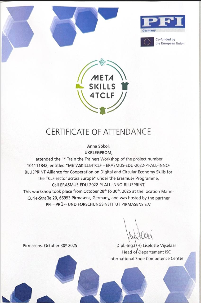 З 28 по 30 жовтня 2025 року в місті Пірмазенс (Німеччина) відбувся триденний тренінг з підвищення кваліфікації та навчання тренерів для галузі легкої промисловості. Захід організовано в межах реалізації європейського проєкту METASKILLS4TCLF — Альянс співпраці у сфері цифрових та циркулярних навичок для сектору текстилю, одягу, шкіри та взуття (TCLF), який фінансується Європейською Комісією в рамках програми Erasmus+. Проєкт реалізується Українською асоціацією підприємств легкої промисловості «Укрлегпром» з 2023 року і триватиме до 2027-го. Україну на офлайн тренінгу представляли фахівці Київського фахового коледжу прикладних наук — Перший день: презентації, цифрові інновації та валідація мікрокваліфікацій