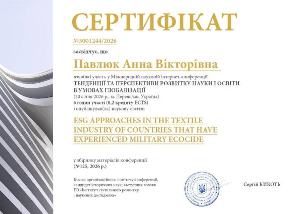 30 січня 2026 року викладачка природничих дисциплін Павлюк Анна та студентка групи БКЛ-25 Алдошина Дар’я взяли участь у Міжнародній науково-практичній інтернет-конференції «Тенденції та перспективи розвитку науки і освіти в умовах глобалізації», що відбулася у місті Переяслав. У межах конференції учасниці представили результати наукових досліджень, присвячених актуальним питанням сталого розвитку та впровадженню сучасних підходів у виробничій сфері. За підсумками роботи конференції було опубліковано наукову статтю під назвою: "ESG approaches in the textile industry of countries that have experienced military ecocide". У статті розглянуто особливості впровадження ESG-підходів у текстильній промисловості країн, що зазнали військового екоциду, а також проаналізовано вплив воєнних дій на екологічну відповідальність бізнесу та перспективи відновлення галузі на засадах сталого розвитку. Учасниці конференції отримали іменні сертифікати.