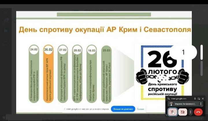 Викладачка ЦК соціальної комунікації Марина Рапаєва для студентів спеціальності «Соціальна робота та консультування» провела тематичне онлайн-заняття до Дня спротиву окупації Криму.